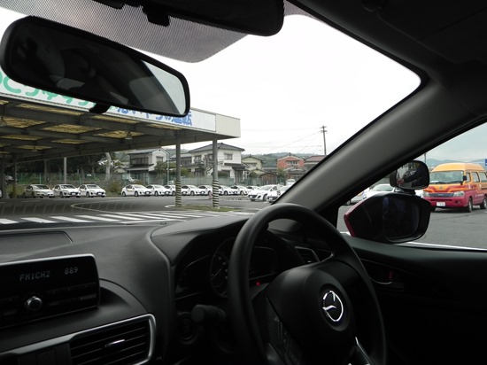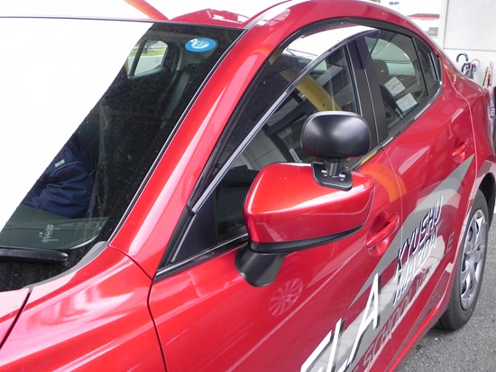 別府校で使用しているアクセラはAピラーが太かったのですが、新モデルはAピラーが後退し細くなっています。死角が少なくなって視認性が改善されています。ミラーの形状や取り付け位置も変更され視認性がかなり向上しています。