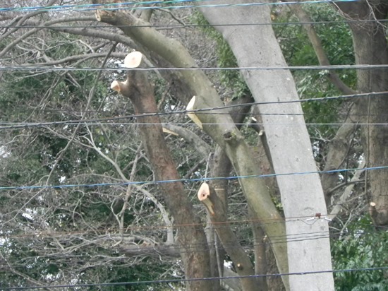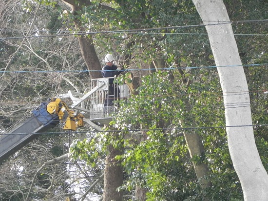 「木を切るのですか?」「枯葉が樋に詰まったり、家に木が倒れ掛かったり苦情が多いので・・・」 「もったいないですね」「あんたくらいやな、もったいないと言うのは、ほとんどの人は喜んでるけどな」 確かに、発着点の屋根に積った枯葉が原因で雨がもれたり、コースが枯葉に埋ってしまうこともあるのですが・・・