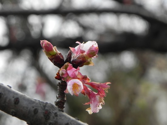 実相寺にある「古寺」バス停前の寒緋桜が開花しました。 昨年より少し早いようです。
