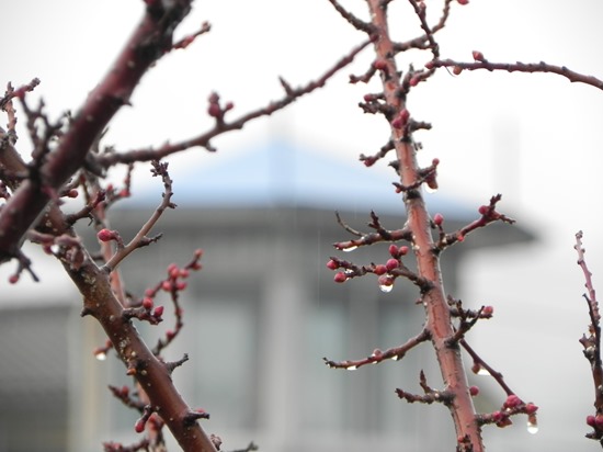 「木の芽起こし」と呼ぶには少々早いようですが・・・ 豊後梅の蕾もふくらんできています。 雨を写真に撮るのは難しいのですが・・・