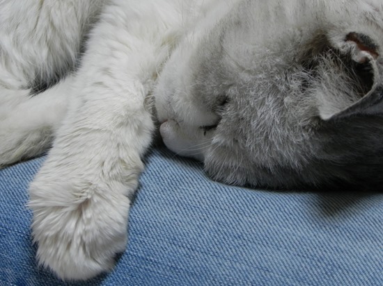 我が家の老猫(ミント=21歳)のお気に入りの場所は娘の足の上です。