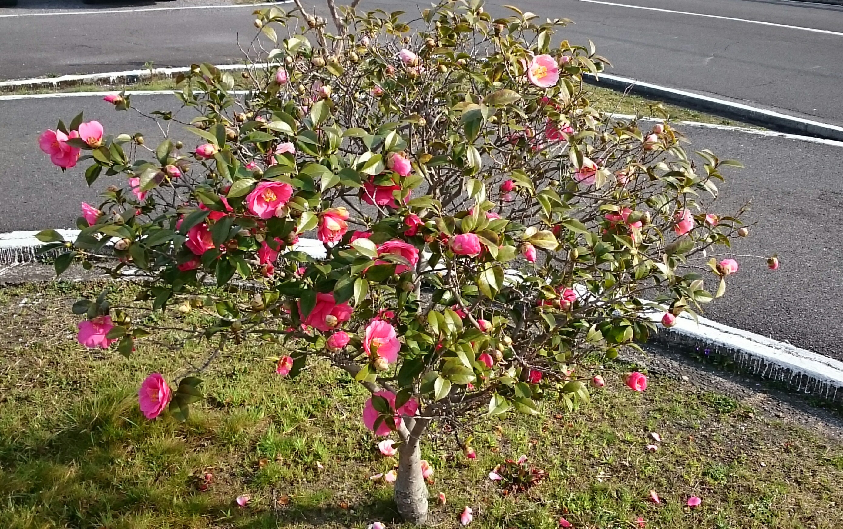 16番S字コースの春サザンカ(正式には何と呼ぶのか分かりませんが・・・)、花びらの散り方はサザンカです(バラバラに散っています、椿は花全体が落ちます。)。