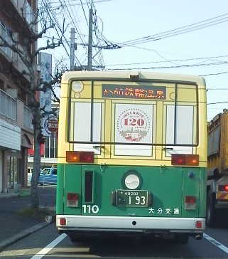 大分交通が創業120周年を記念して運行しているラッピングバスです。路上教習中も見かけることがあるのですが教習生は興味が無いようです。