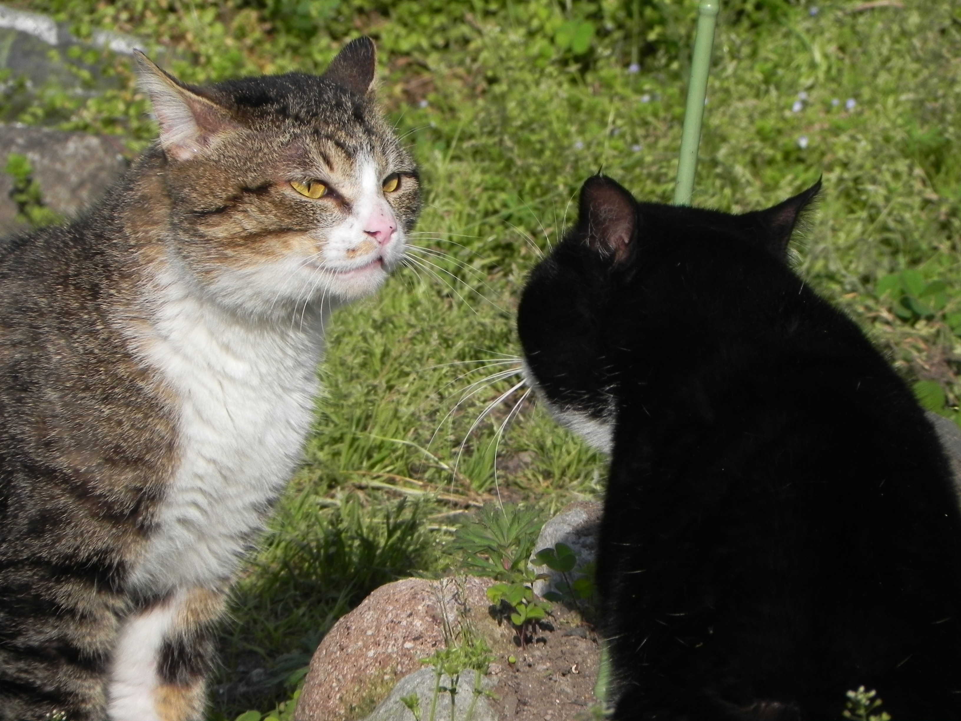 早朝の大荒れのお天気が嘘のような日曜日の午後です。昨夜から喉が痛くて体の節々が痛みます。どうやら風邪をひいたようです?大切なお孫ちゃんにうつると困るので二階に隔離されています。なにやら外が騒がしいのでベランダに出てみると近くの草むらで猫ちゃんがにらめっこしていました。早速、望遠でパチリです。