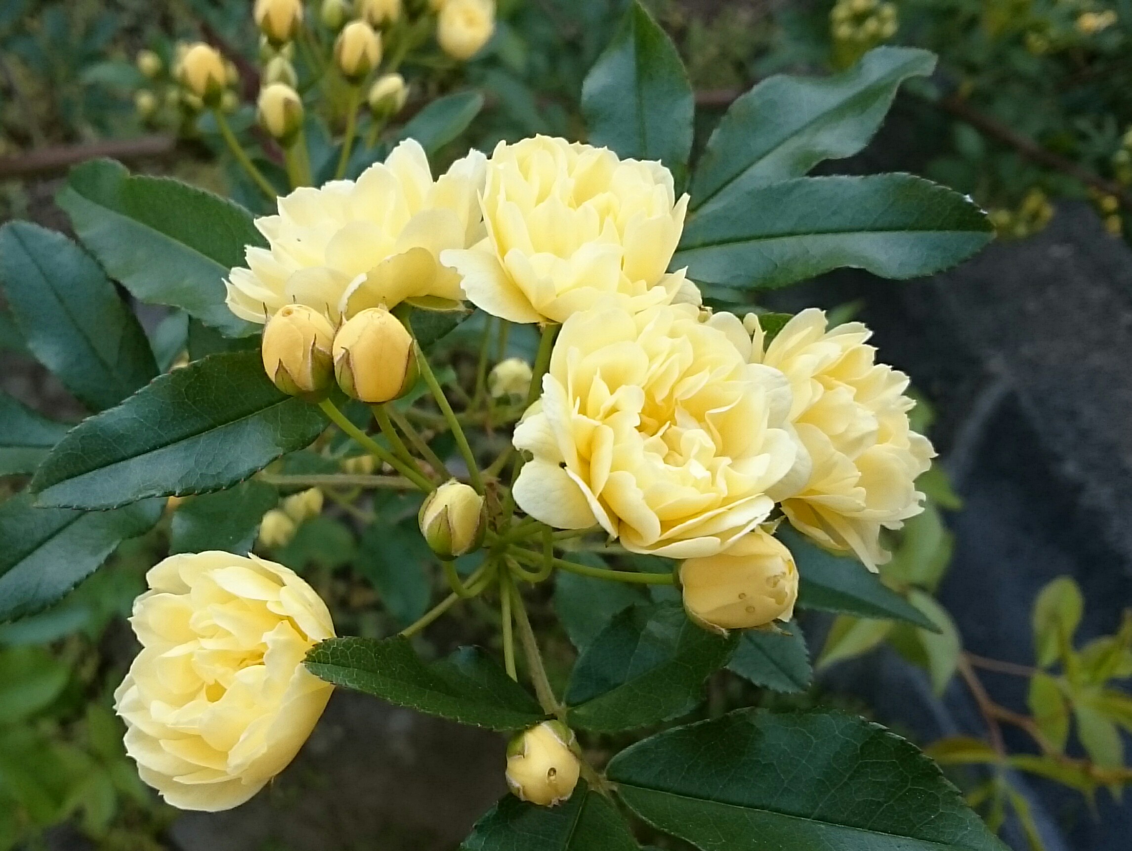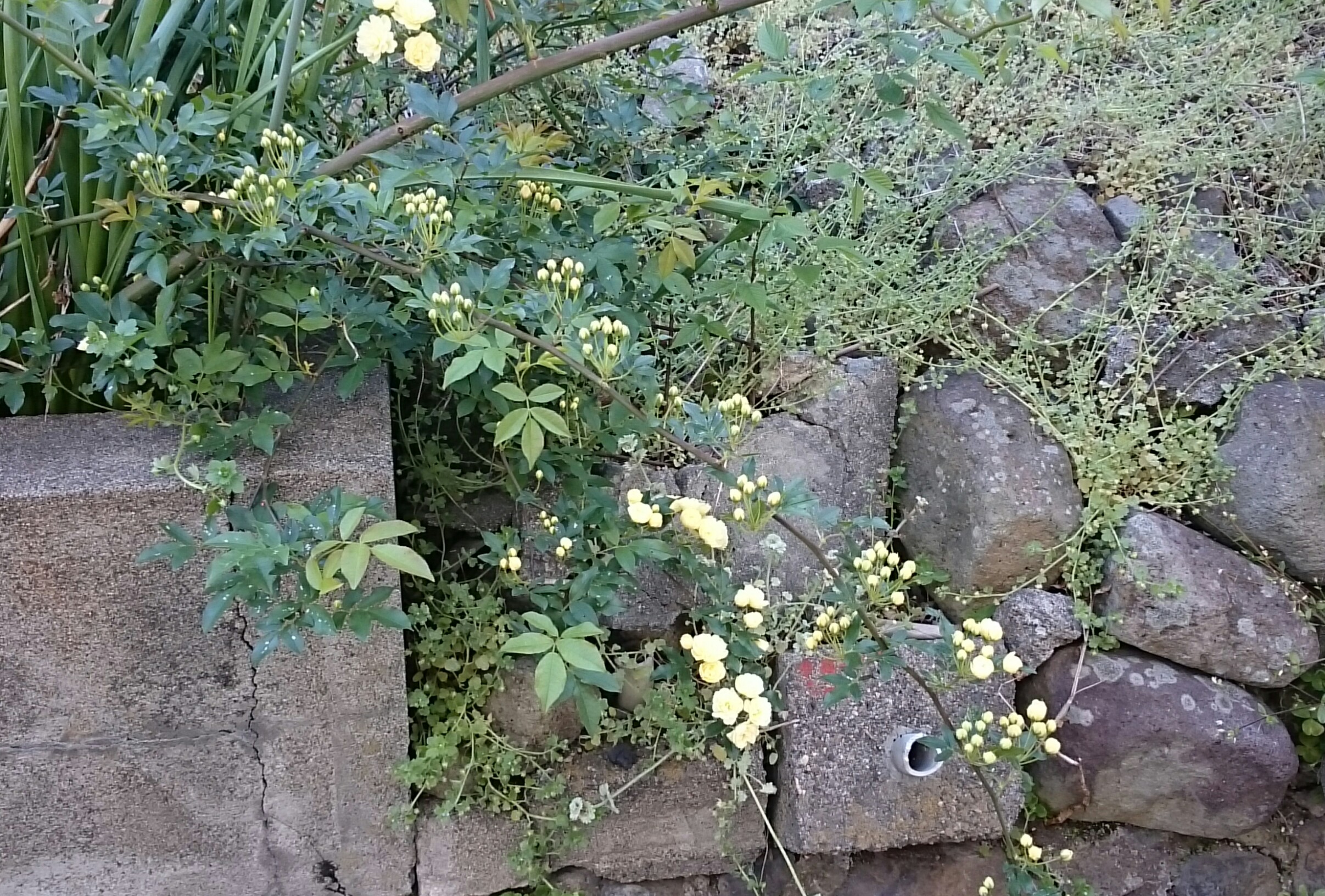 洗車場(講習車駐車場の隣)裏手のモッコウバラが咲きました。小さい花なので気がつかない人も多いかもしれませんが、黄色い可愛い花が咲いています。