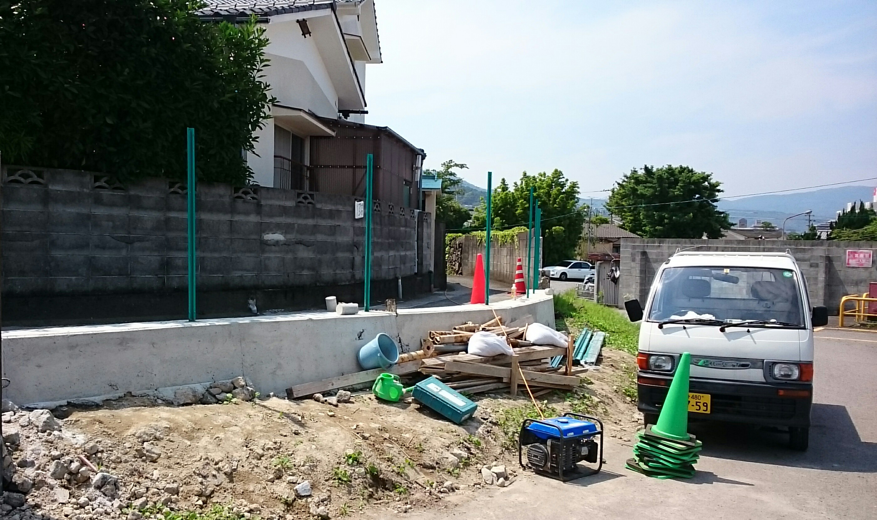 地震のために壊れた石垣を撤去してフェンスを設置する工事を行っていますが人手不足とのことでなかなか先へ進みません。やっとフェンスを取り付ける柱が立ちました。