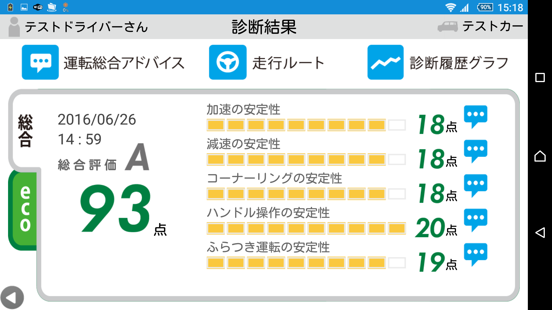 走行経路も記録されます。衝撃や急な加減速等があると経路上にマークが印されマークをタッチするとその前後のドライブレコーダーの記録が再生出来ます。wpid-wp-1467114206295.png参加者の中でのランキングも表示されます。