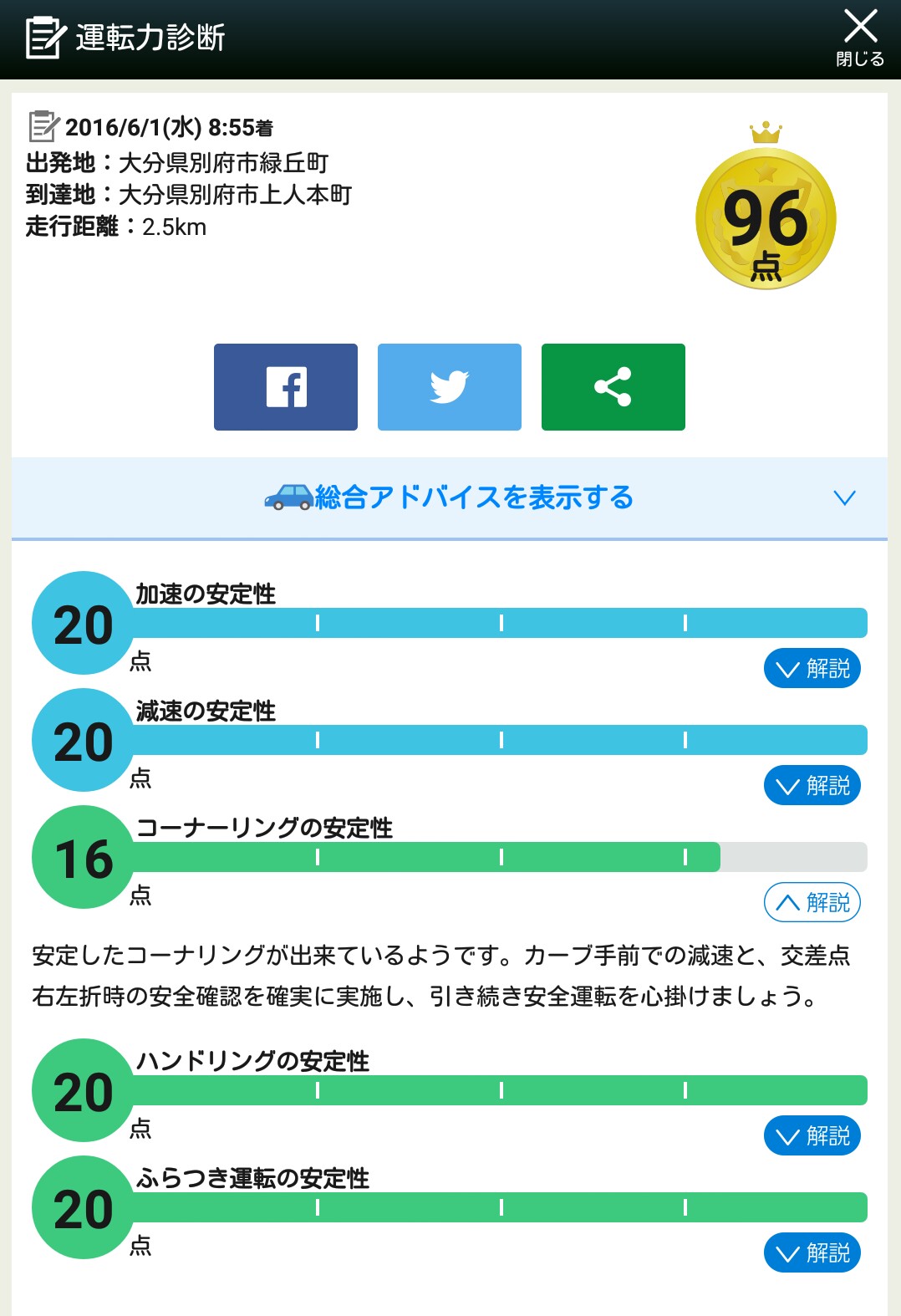 最高得点は「96」です。アドバイスに忠実に走っているのですが、コーナリングの項目で満点が取れません。