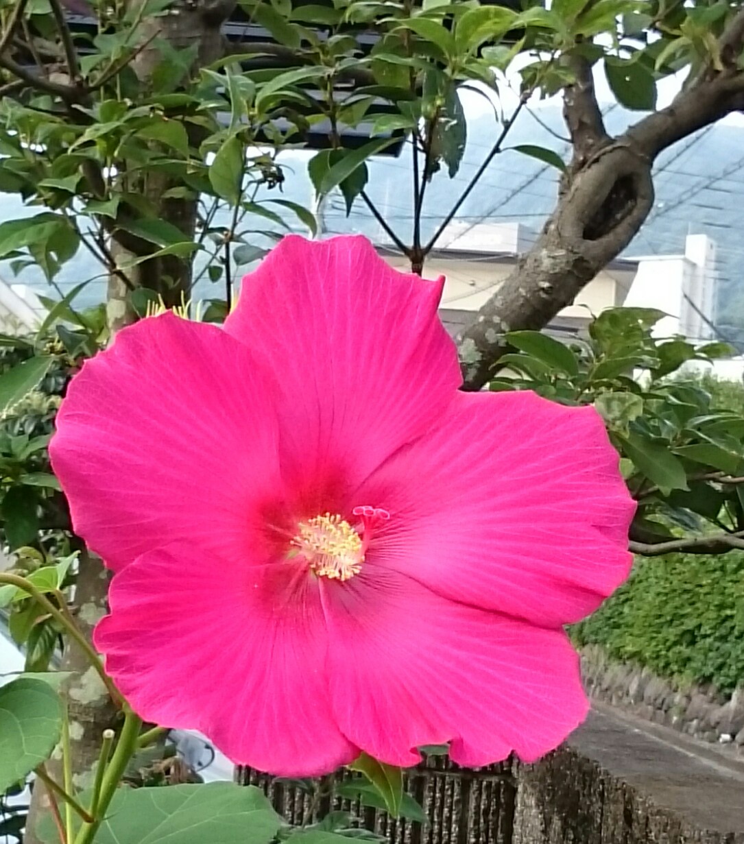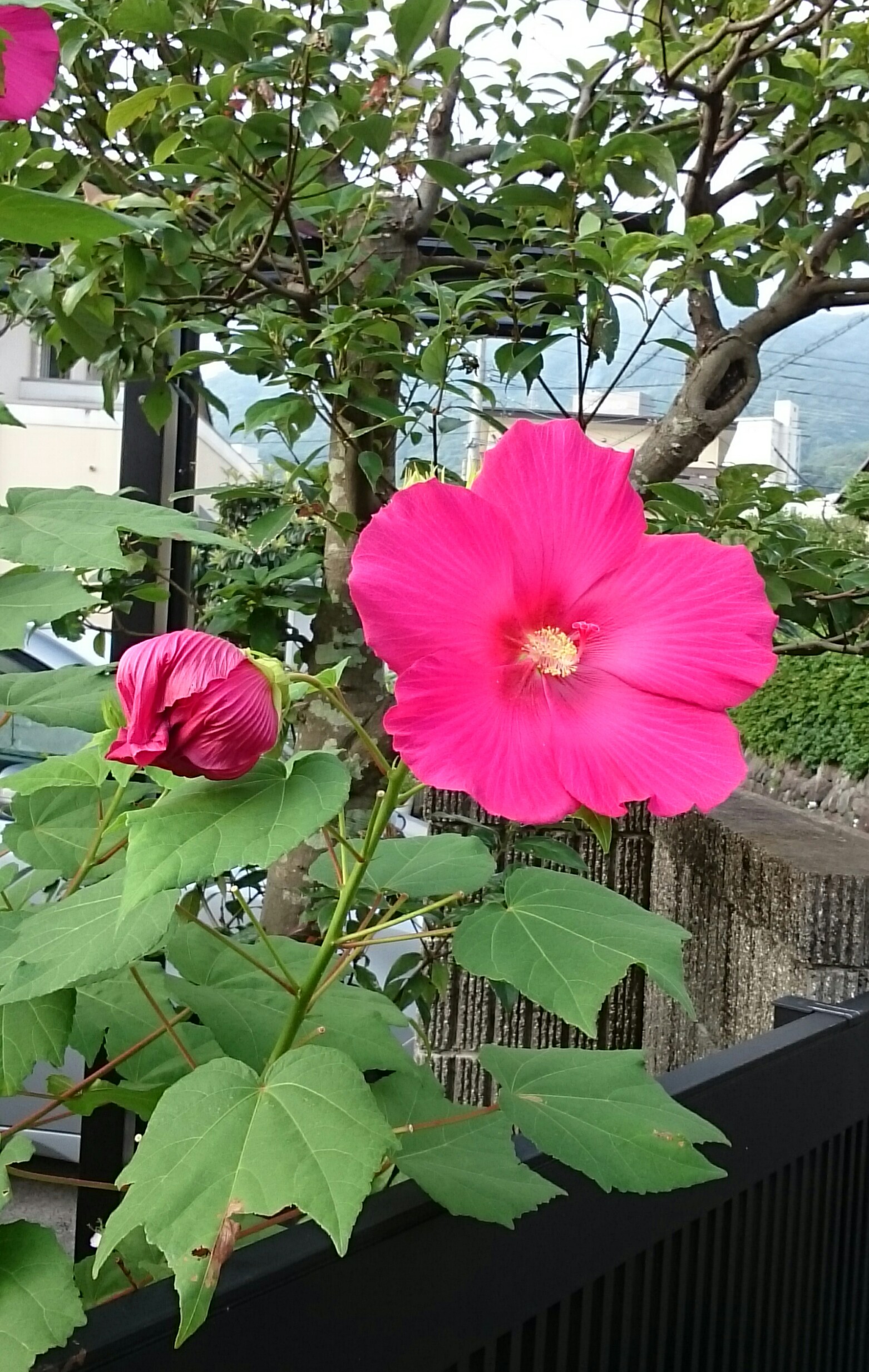 ご近所の庭で見かけた芙蓉です。木槿やハイビスカスに近いのでよくにていますが、葉を見ると違いがよくわかります。