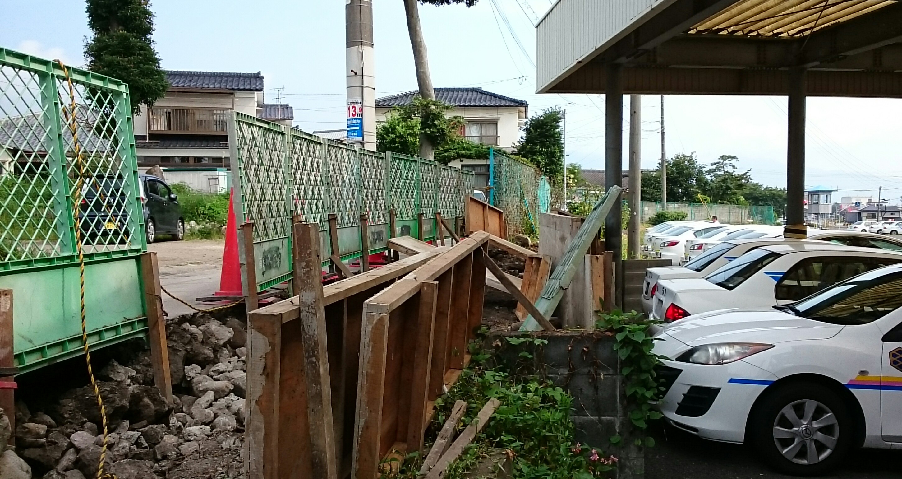 4月の地震で壊れた石垣をフェンスに置き換える工事が最後のブロックに入りました。近所の人は明るくなったと喜んでいますが、土埃を遮る壁が無くなったので風が吹くと砂が……