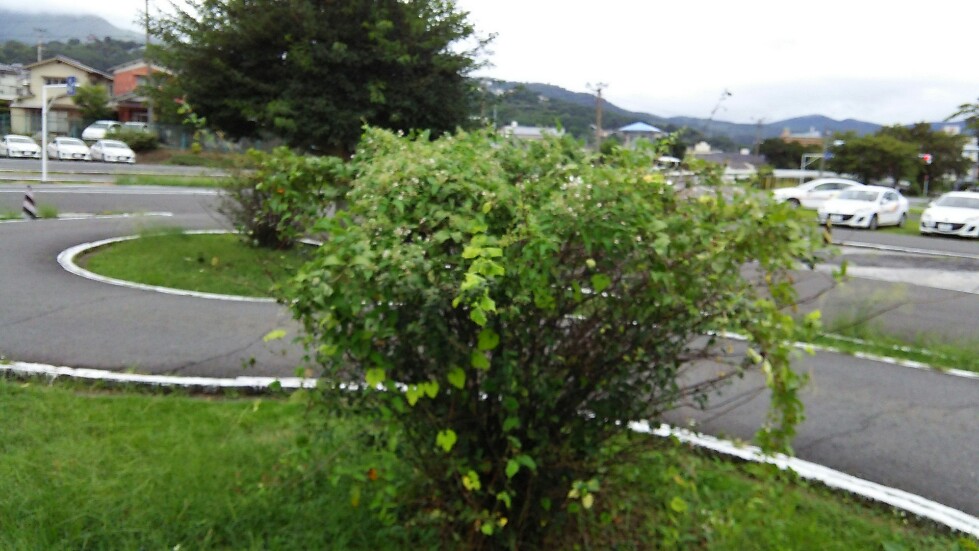 13番S字コースの木瓜の木に巻き付いた葛に花が咲いています。
