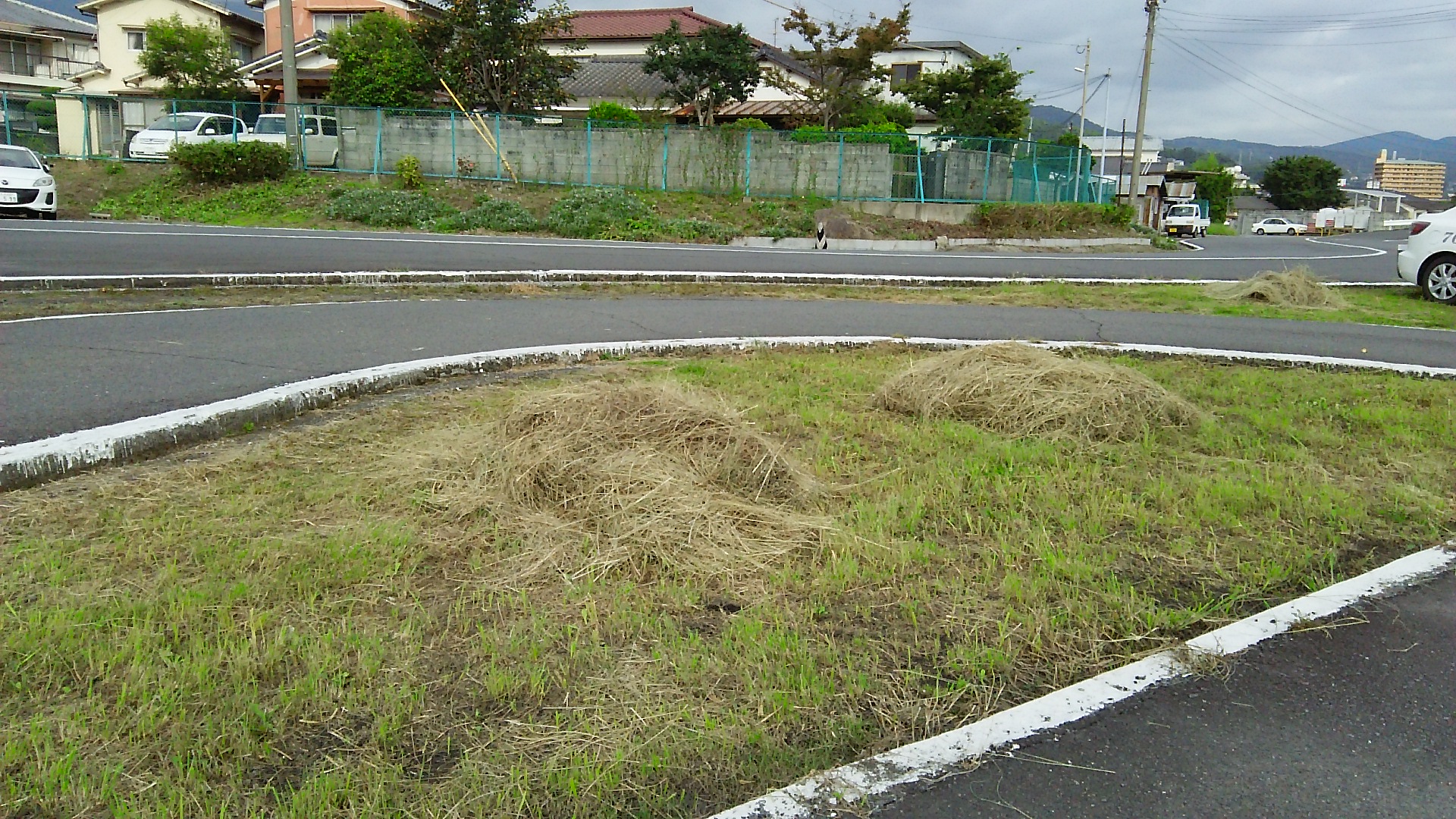 場内コースには、刈られた草の山がいくつも出来ています。これを片付けたらもう一度草刈りをして仕上げます。その他にも縁石の補修やリッタ障害物のポールの取り替え等々、そしてコースのラインも引き直します。一年に一度のリフレッシュです。