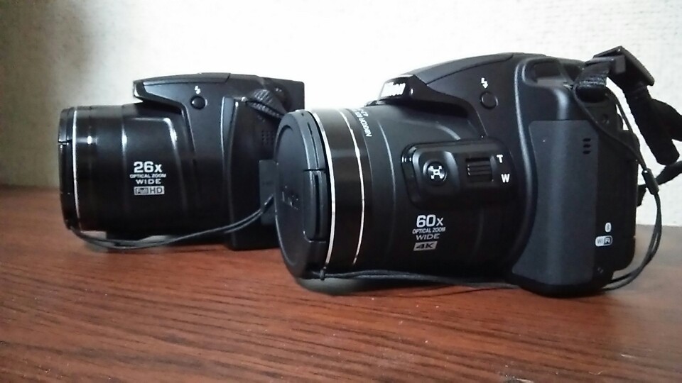 左側が旧型のCOOLPIX P100、右側が新型のCOOLPIX B700です。いずれもNikonのコンデジ中級機で見た目も良く似ていますが、P100は光学26倍、B700は光学60倍ズームです。しかも、B700はWiFiやBluetooth等でスマホとリンク出来ます。