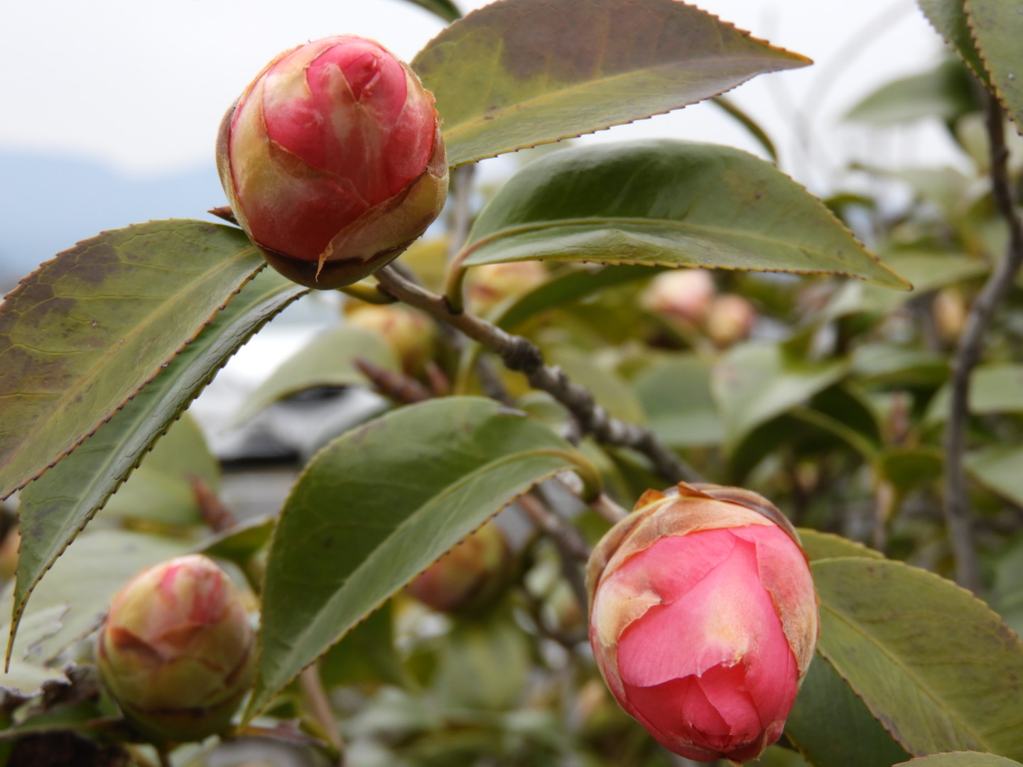 今はツバキの季節ですが、別府校ではサザンカが同時に咲いています。これがツバキです。こちらがサザンカです。ツバキの花です。サザンカの花です。 よく似ているので区別がつきにくいのですが、葉に違いがあります。また、花が散るときにツバキは花がそのまま落ちます。サザンカは花弁がバラバラに散ります。 通常サザンカは冬に咲きますが、13番S字コースのサザンカはツバキの季節に咲きます。