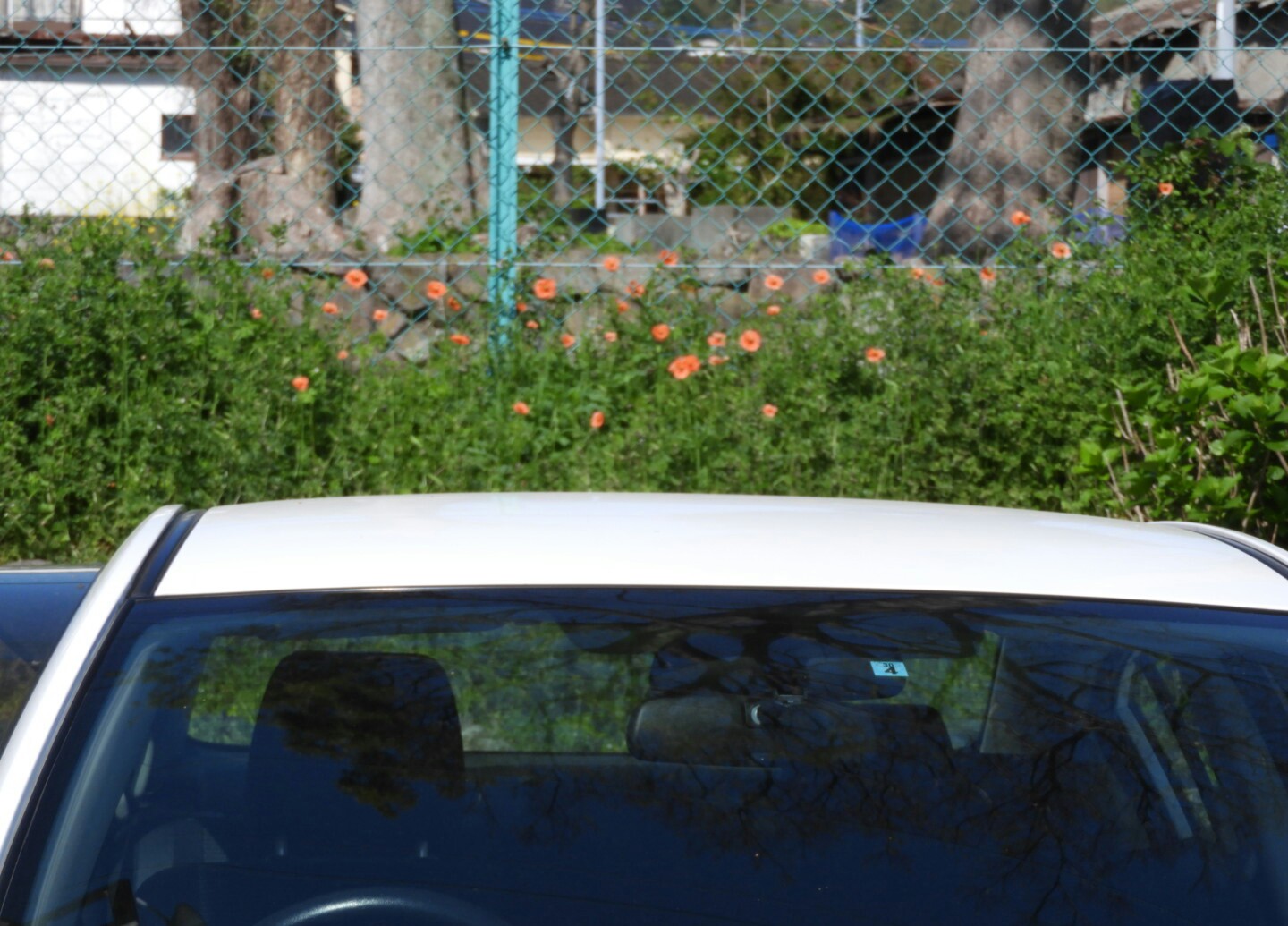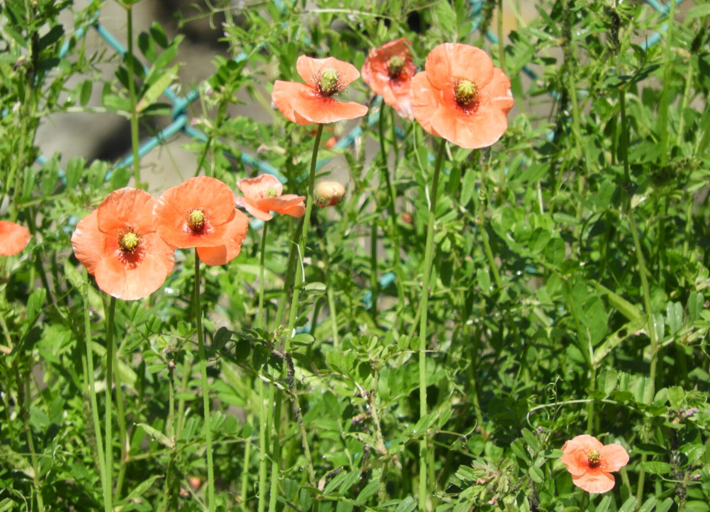 教習車の駐車場の後ろの土手にヒナゲシがたくさん咲いています。