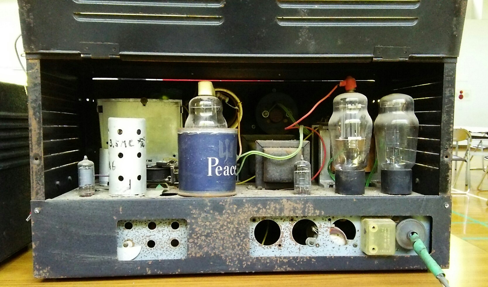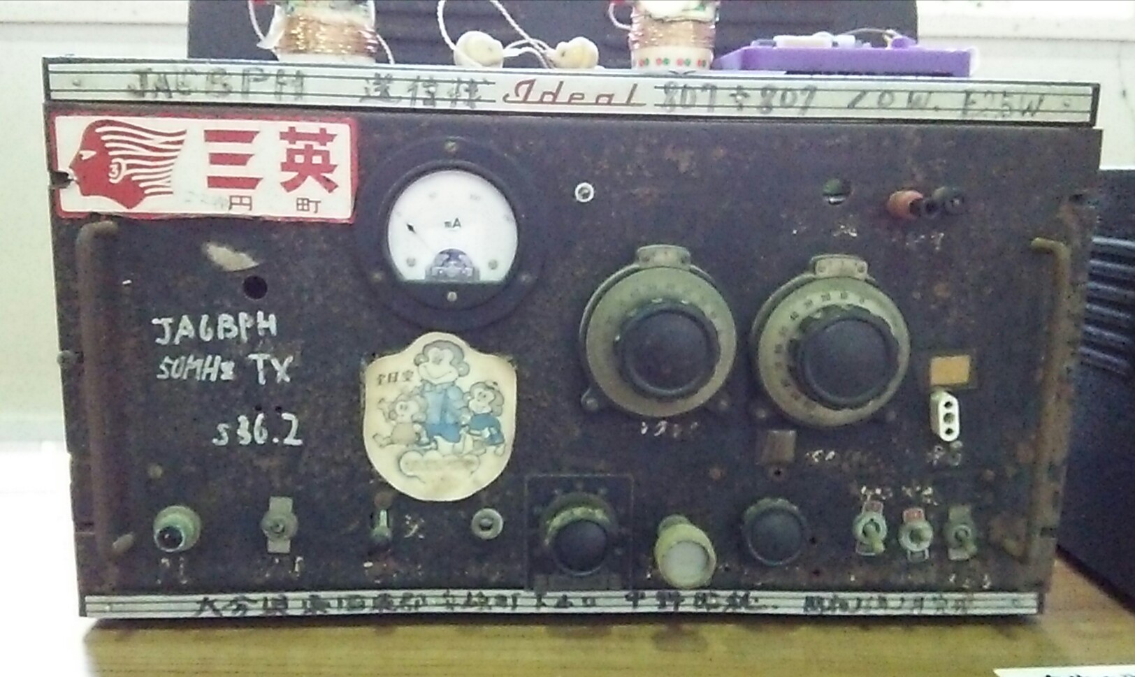 昨日の会場に展示されていたJA6BPH手製の50MHz送信機です。昔はこのような手作りの機器で交信していました。ケースの上部に「Ideal」と言う金属ケースメーカーのロゴが見えます。2枚目の写真は裏側です。送信部の終段管(807)のシールドに缶ピースの空き缶が使われています。低周波部の終段も807が使用されています。