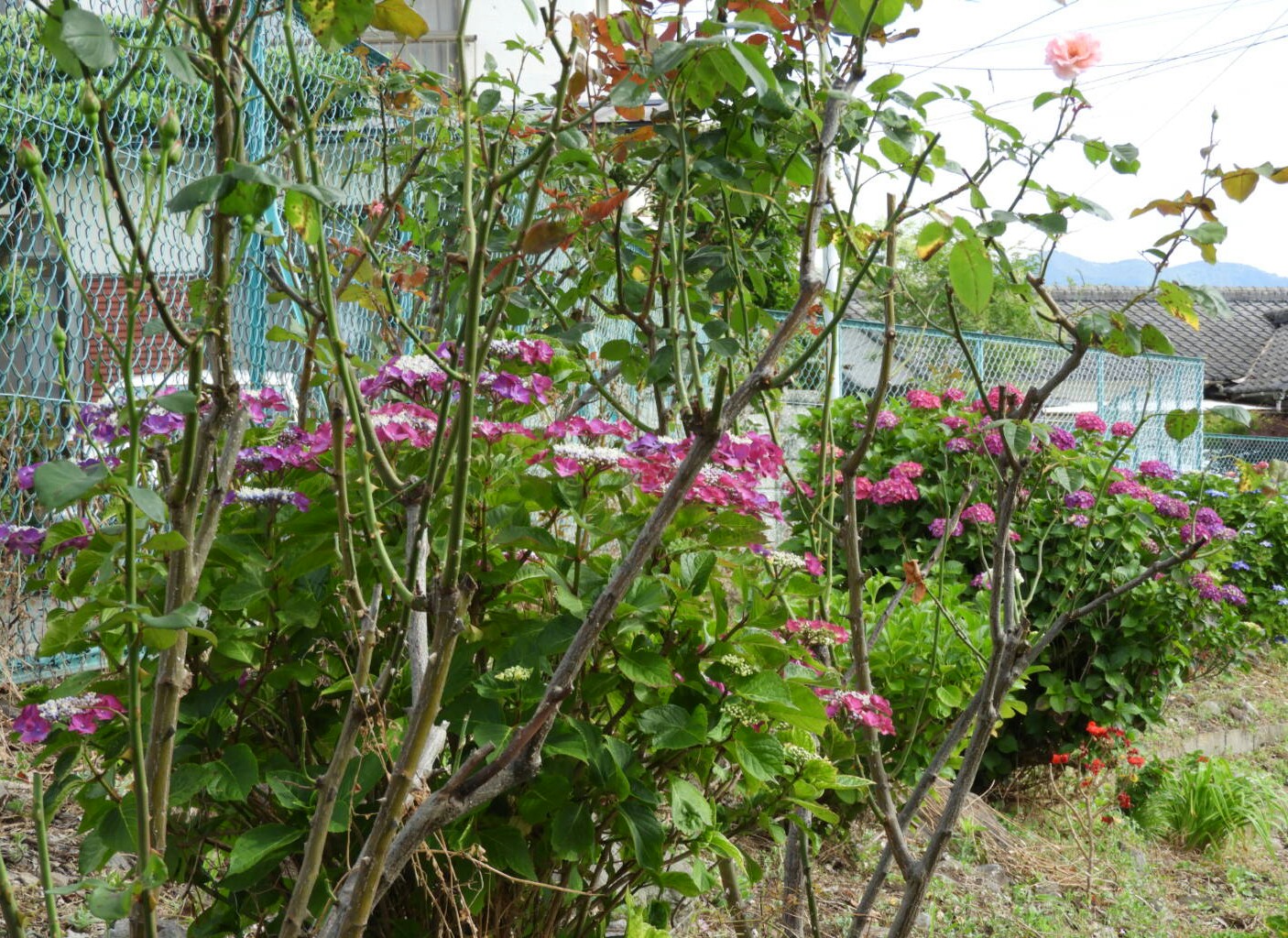 額紫陽花もバラもイキイキしています。