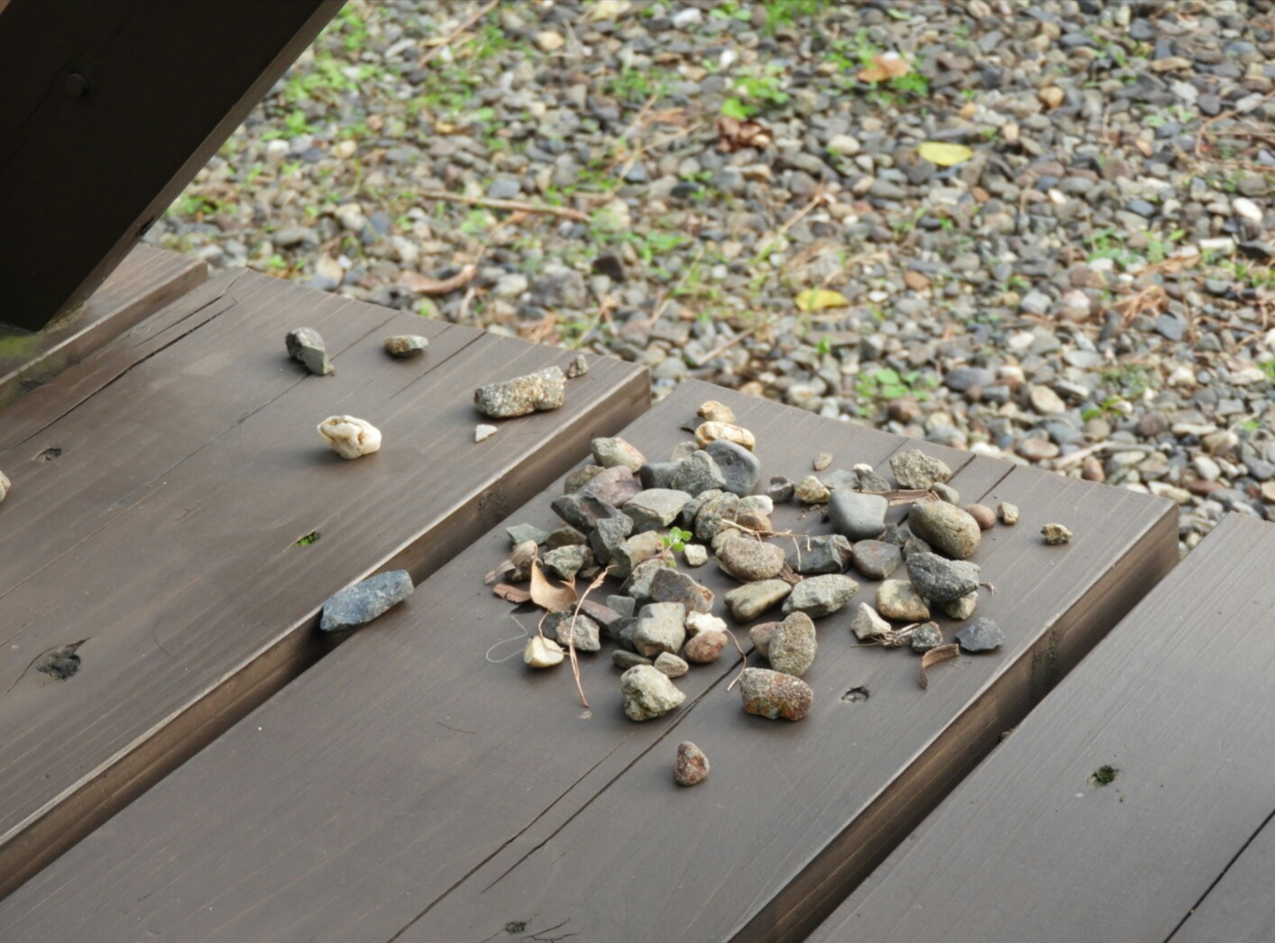ウッドデッキの上に庭の小石がたくさん置かれています。