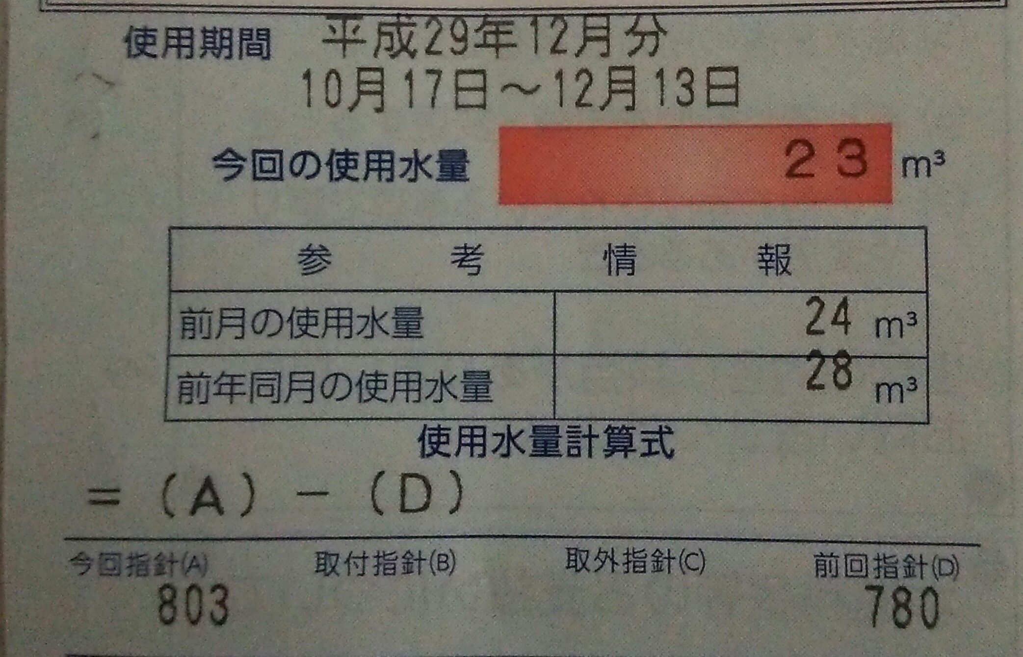 我が家は温泉をなので風呂を沸かさないため、元々水道使用量は少なくて3人家族1月分(H24東京都水道局生活用水実態調査)相当となっています。