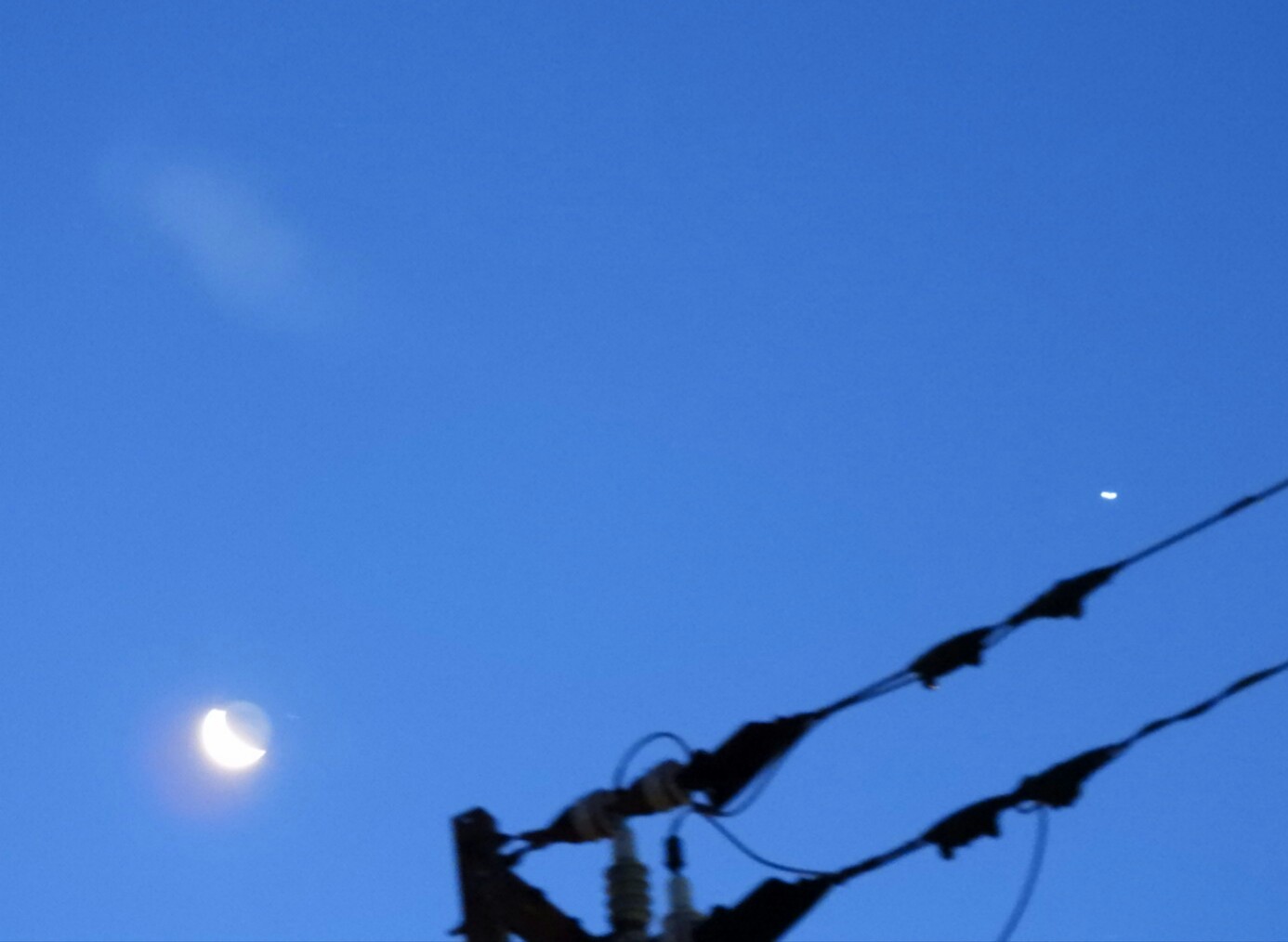 今朝、7時頃の南東の空です。月のやや右上に明るい星が見えています。木星か火星なのですが、木星の方が明るいし赤く見えていないので木星だと思います。