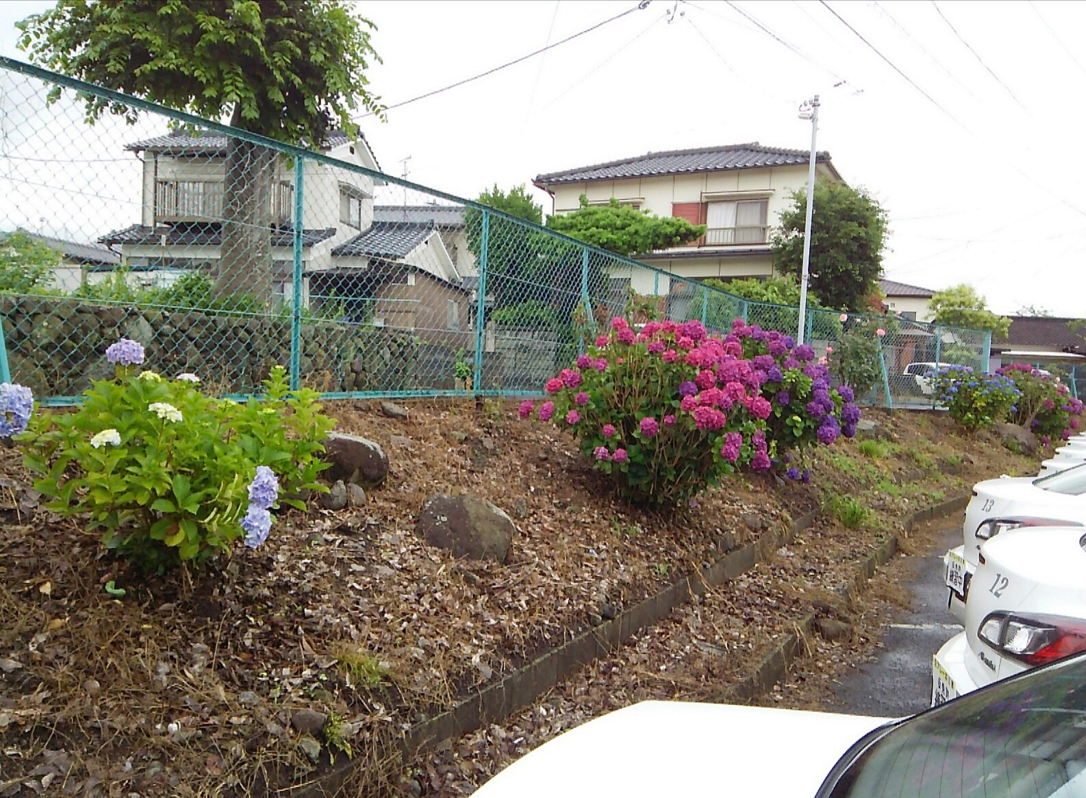 先週、母が亡くなりまして、一週間お休みをいただいておりました。その間に場内コース西側土手の紫陽花が満開になっていました。