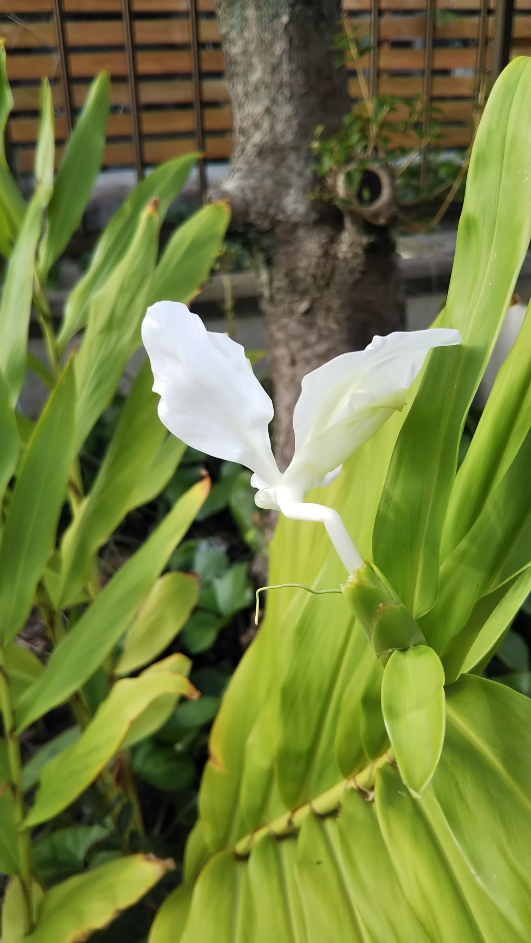ジンジャーとも言いますが生姜の花ではありません。でも、生姜の親戚ですから葉や根が似ています。花に近づくとよい香りがします。