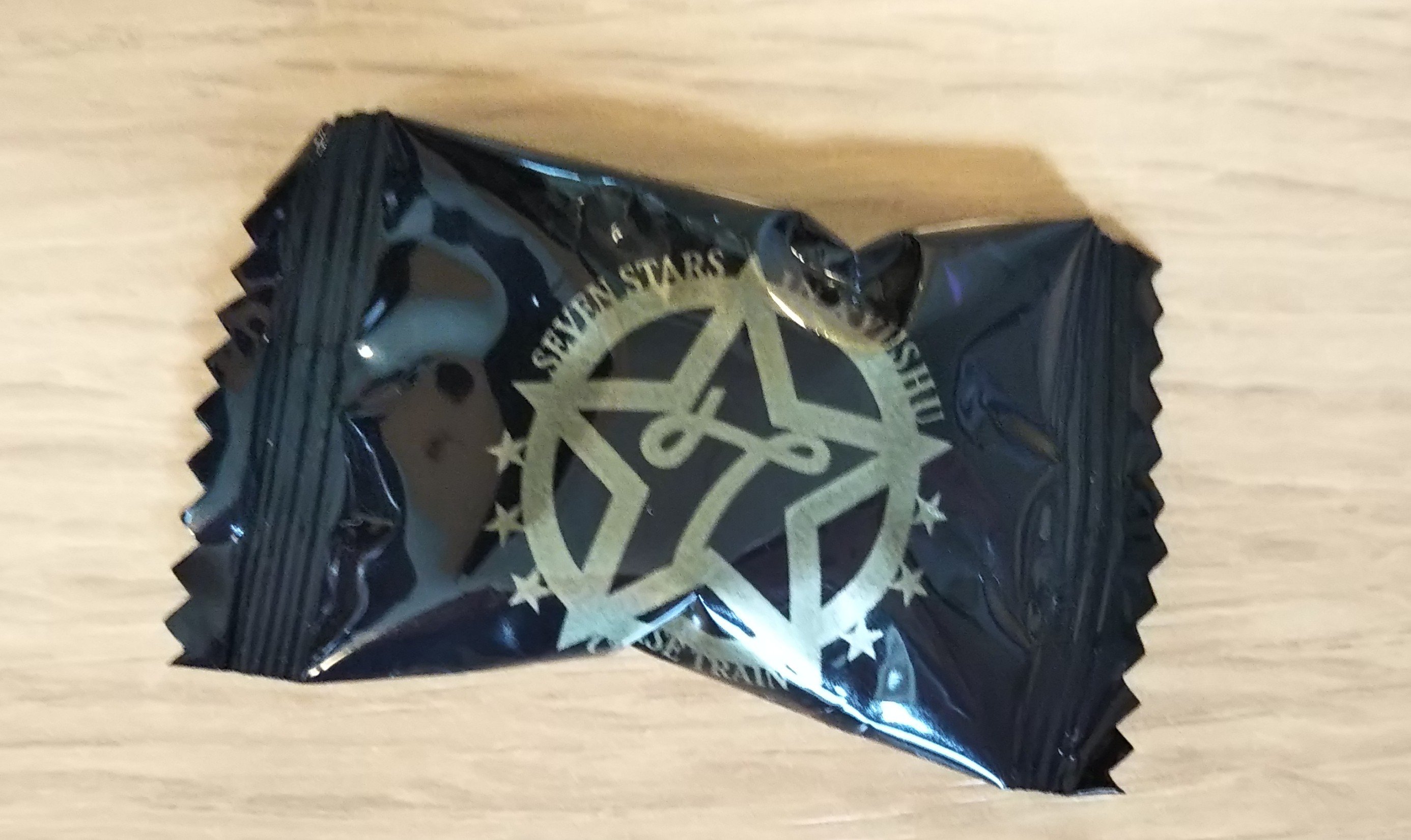 うちのお孫ちゃんを見つけたアテンダントのお姉さんが手招きをするので側に行ってみたら「ななつ星のキャンディー」をくれました。