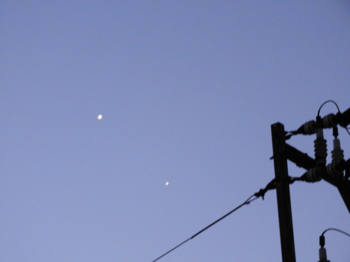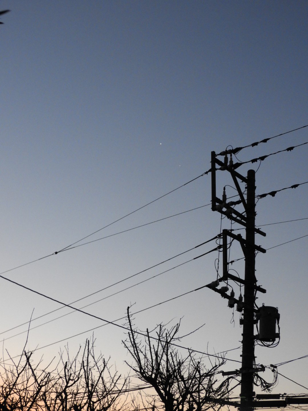 今朝、7時頃の東南の空です。この写真では分かりにくいのですが、これだけ明るくなっても明るく見える星が2つ見えています。上に見える、ひときわ明るい星が金属で、その下に見えているのが木星です。