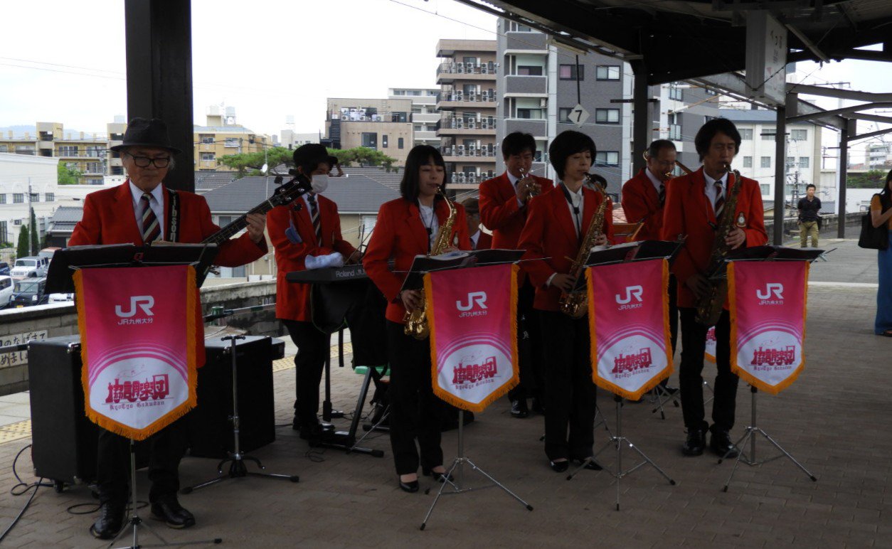 別府駅では明星幼稚園の園児とベッピョン、そしてJR九州大分協調楽団がお出迎えです。もちろん大勢の鉄道ファンもカメラやスマホを構えていました。