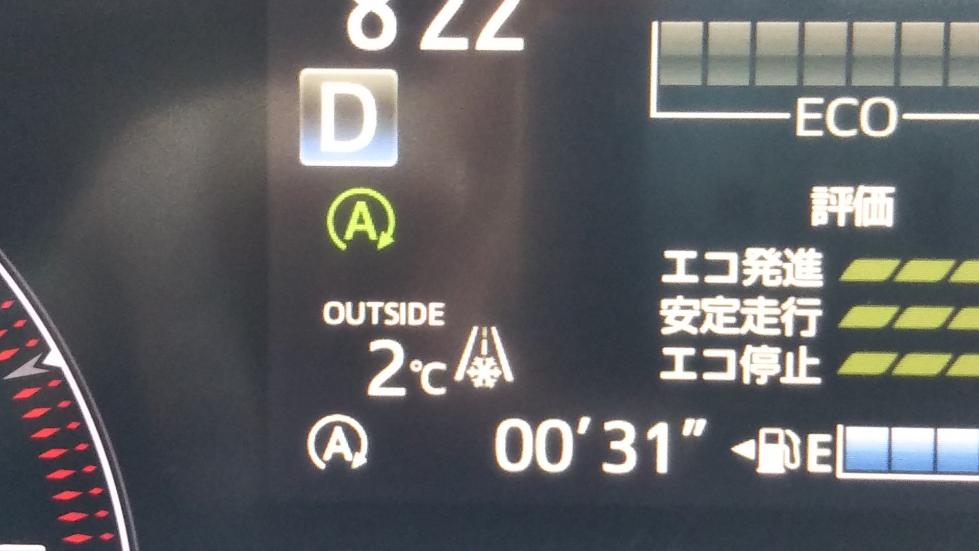 車のメーターパネルに表示されている車外温度は2℃ 雪の結晶マークが出ています。