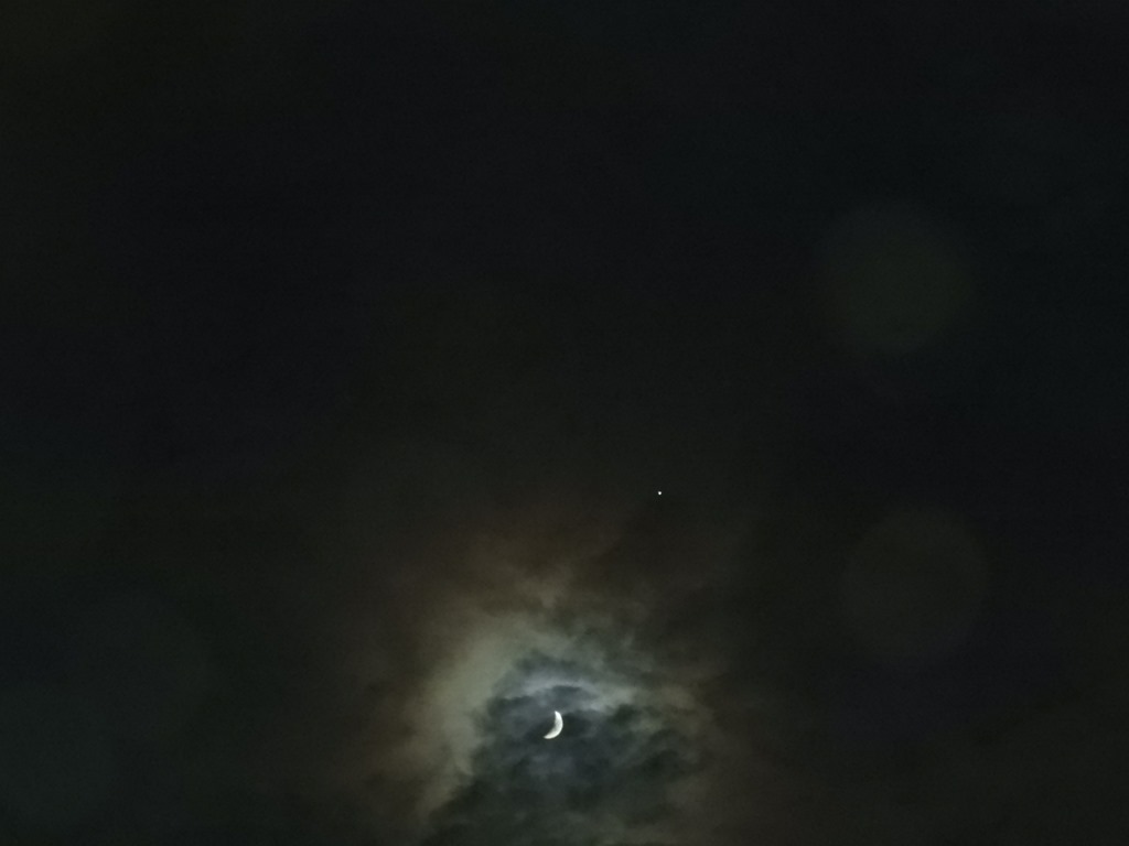 生憎の曇り空、右斜め上に木星は見えていますが土星や金星は雲に隠れて見えませんでした。 土星は木製のもう少し右やや下、金星はさらに右下方向に見えるはずでした。