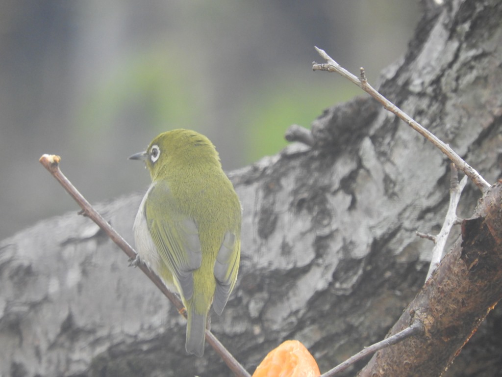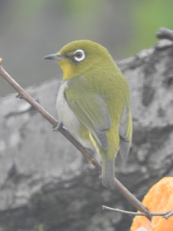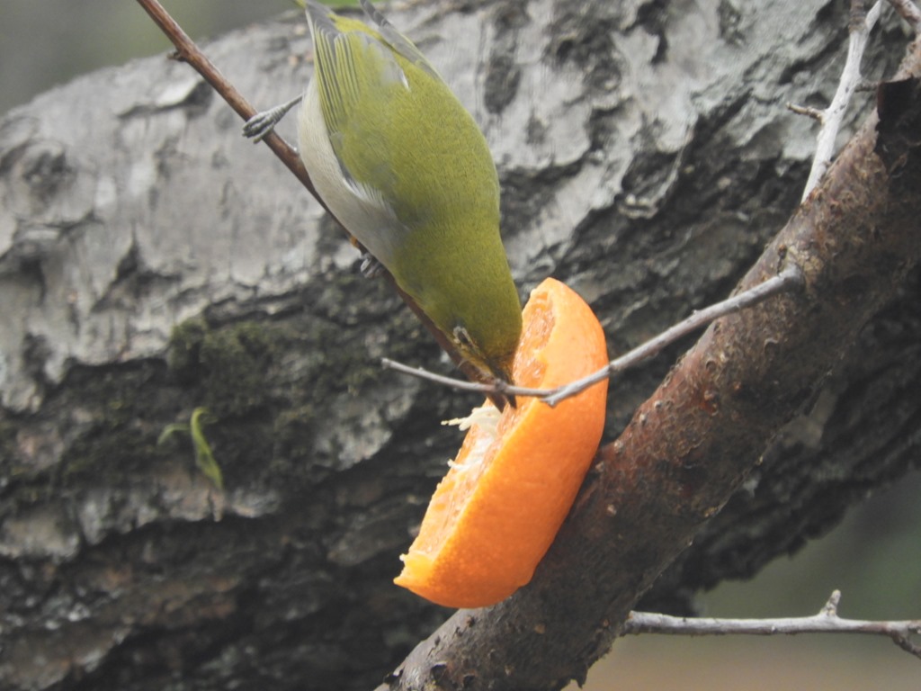 庭の豊後梅の枝にミカンを刺したら、メジロがやってきました。