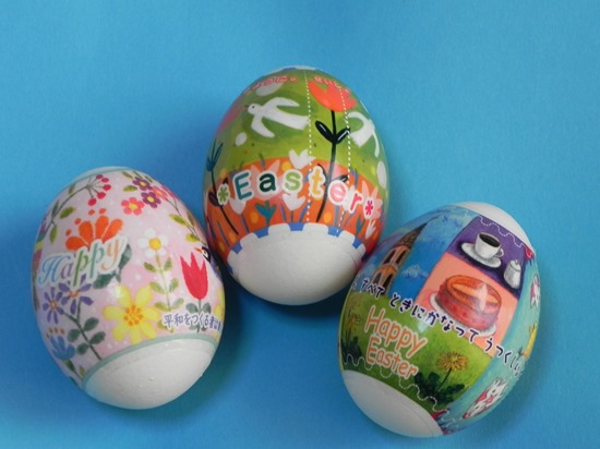 今日はイースター(復活祭)、クリスマスは日本人の生活にすっかり溶け込んでいますがイースターはなじみがうすいようですね。 写真はイースターエッグです。 昔は玉子の殻に直接色を塗ったり絵を描いていましたが、最近は専用のフィルムがあるようです。