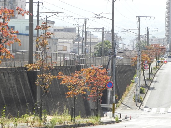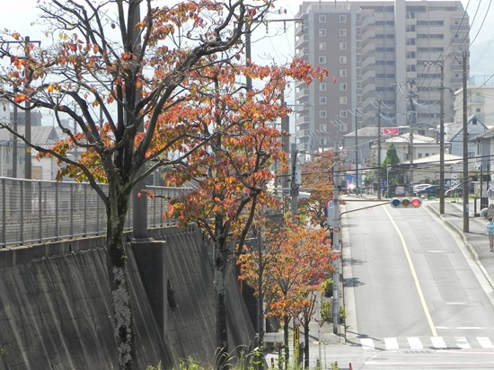 JR日豊本線と平行に走る市道の街路樹「ハナミズキ」の葉が紅くなりました。