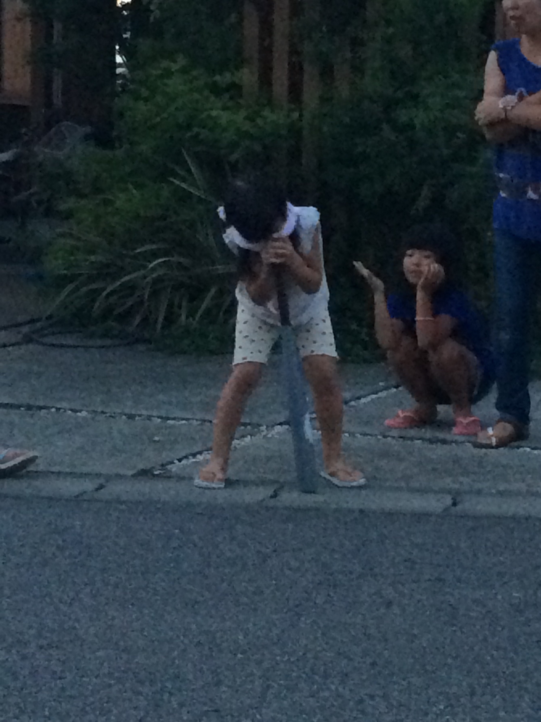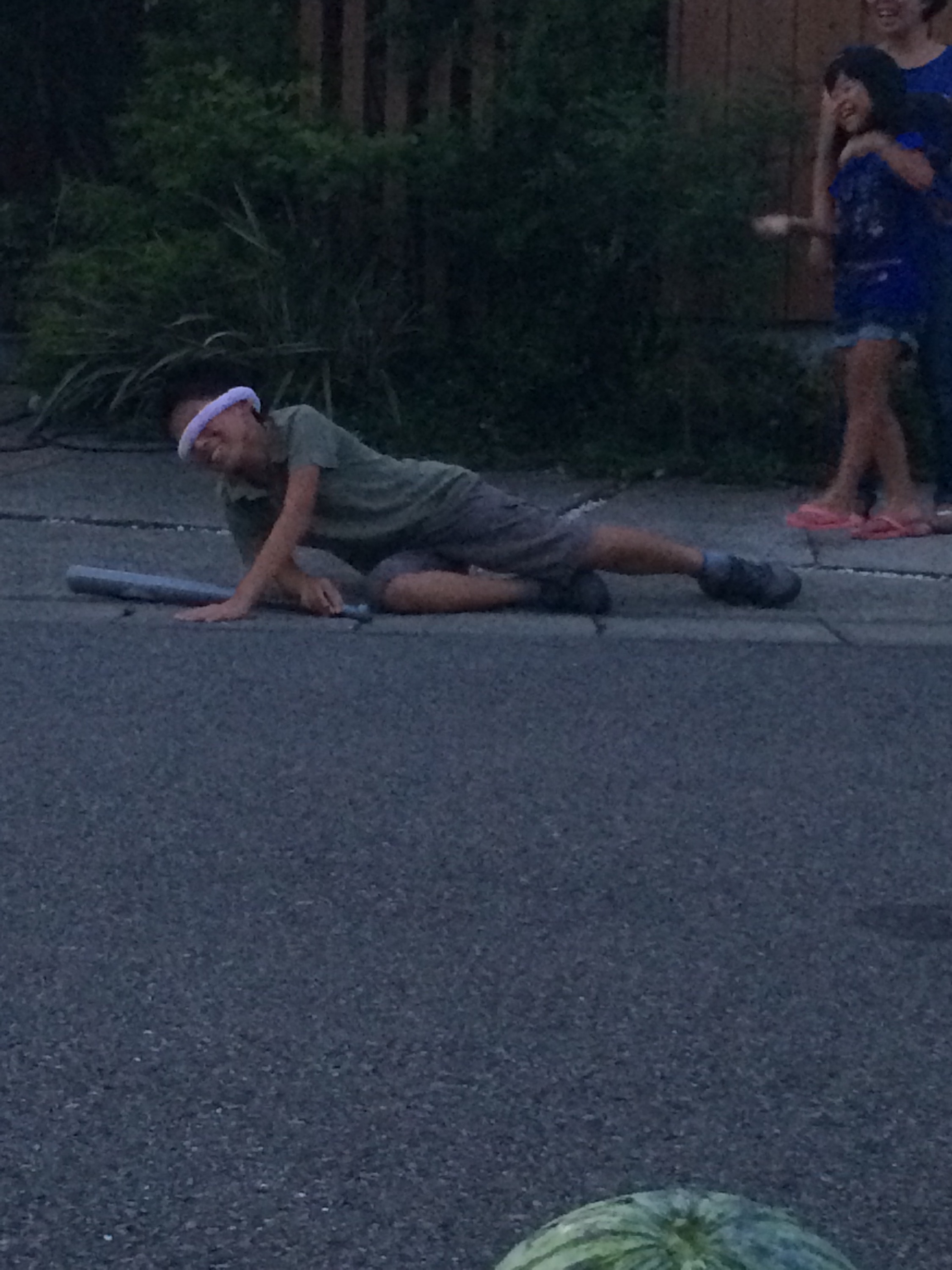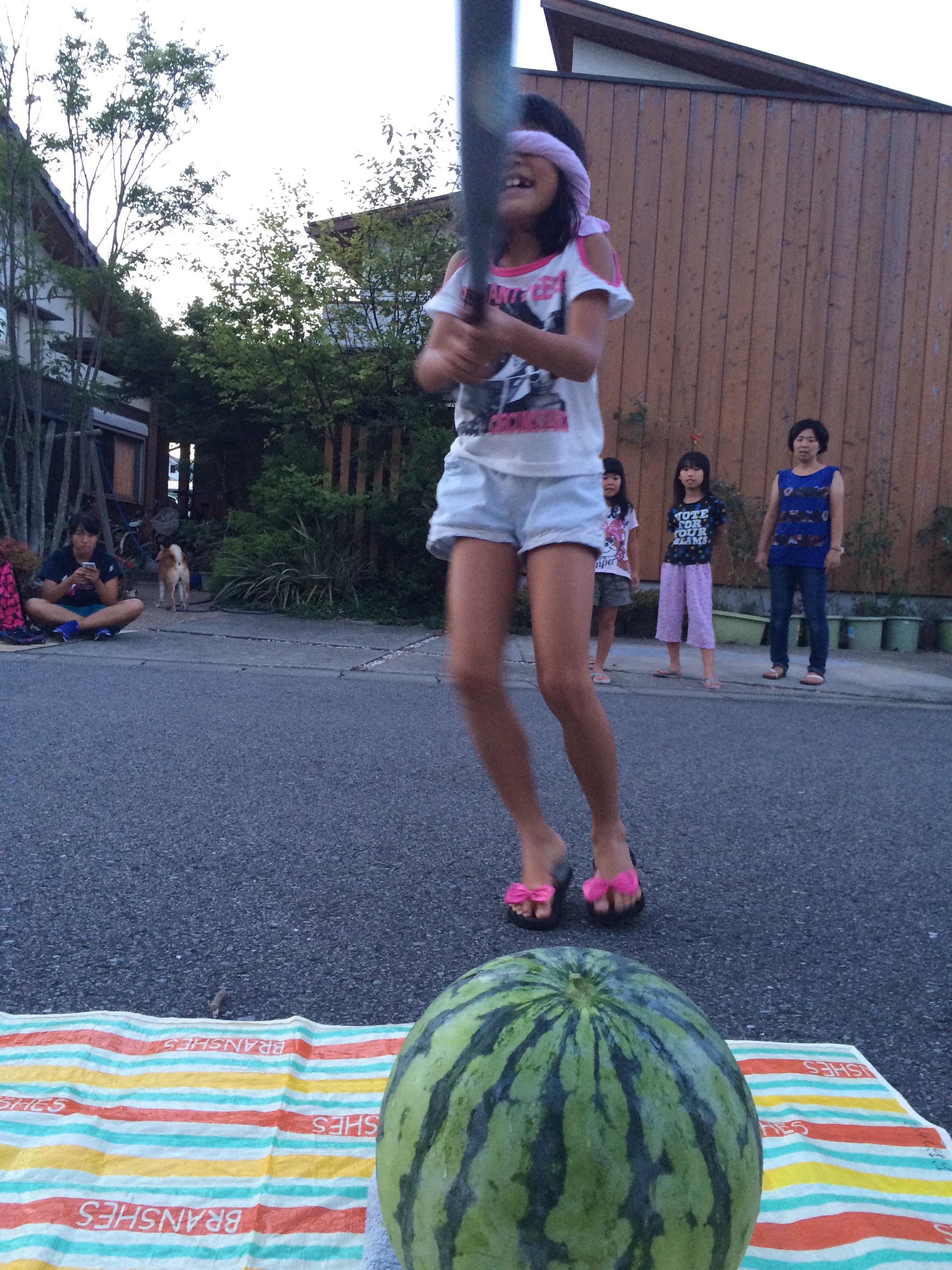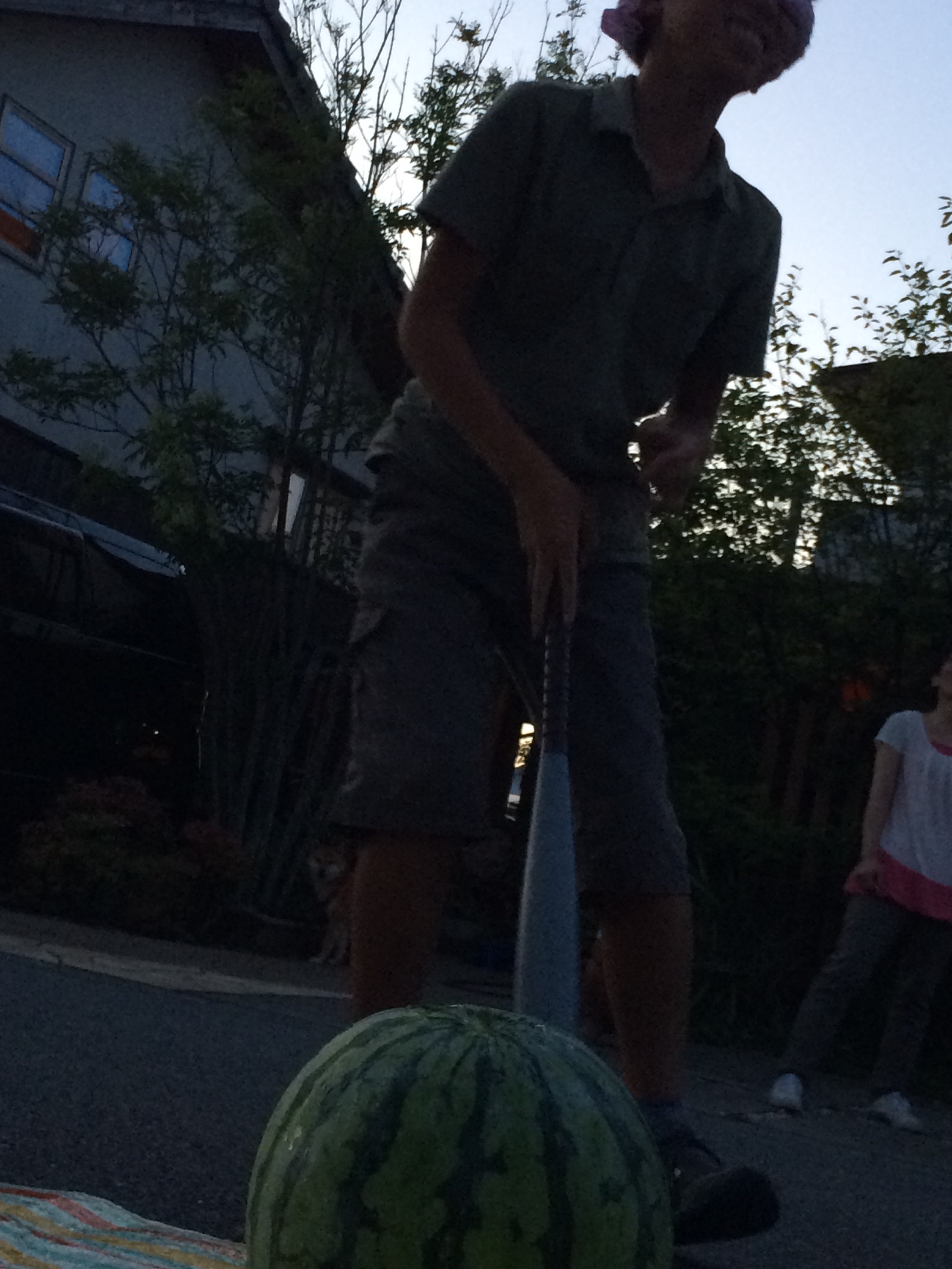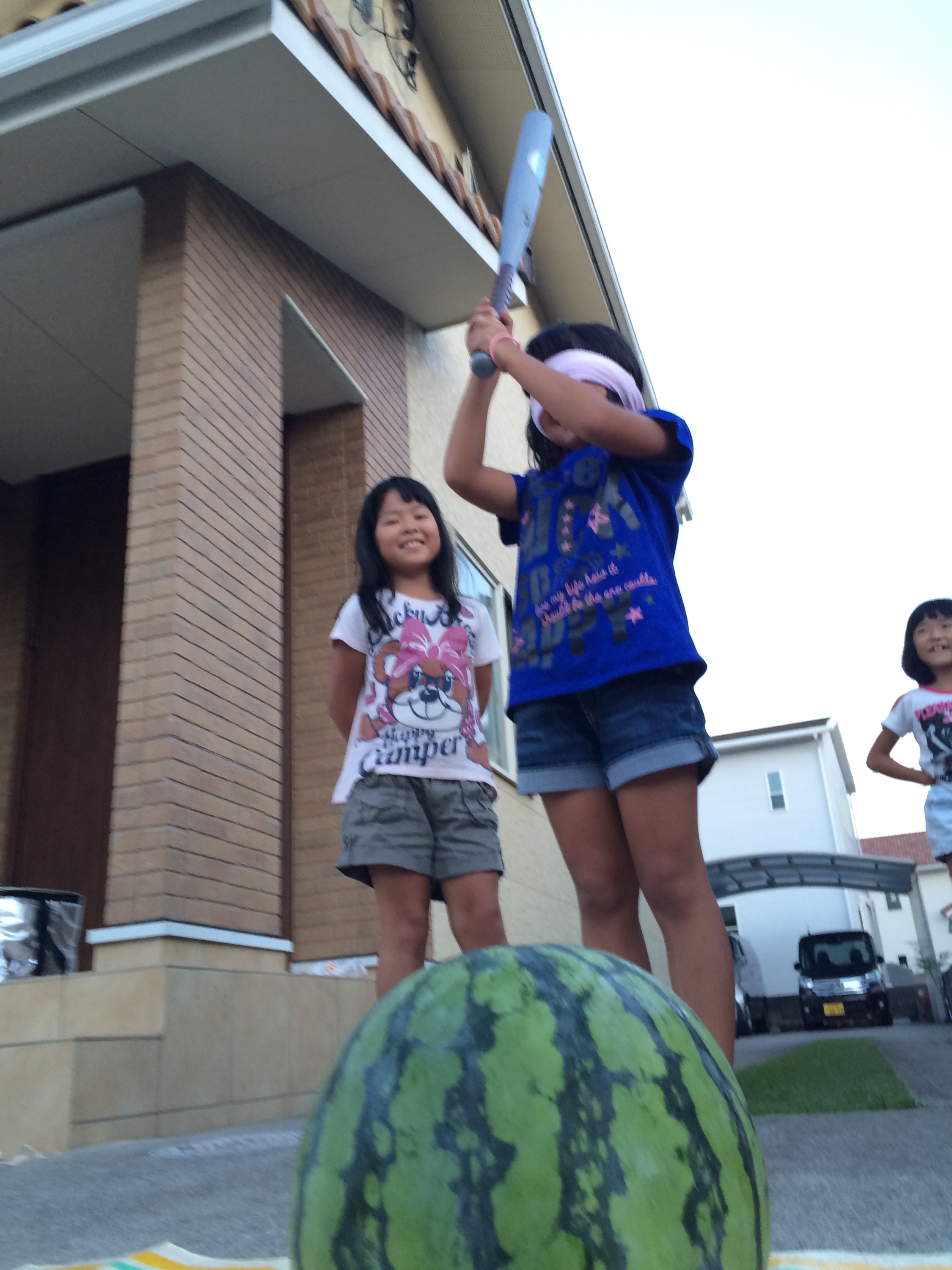 女の子が叩いてもなかなか割れなかったスイカですが、トドメは男の子が‼︎