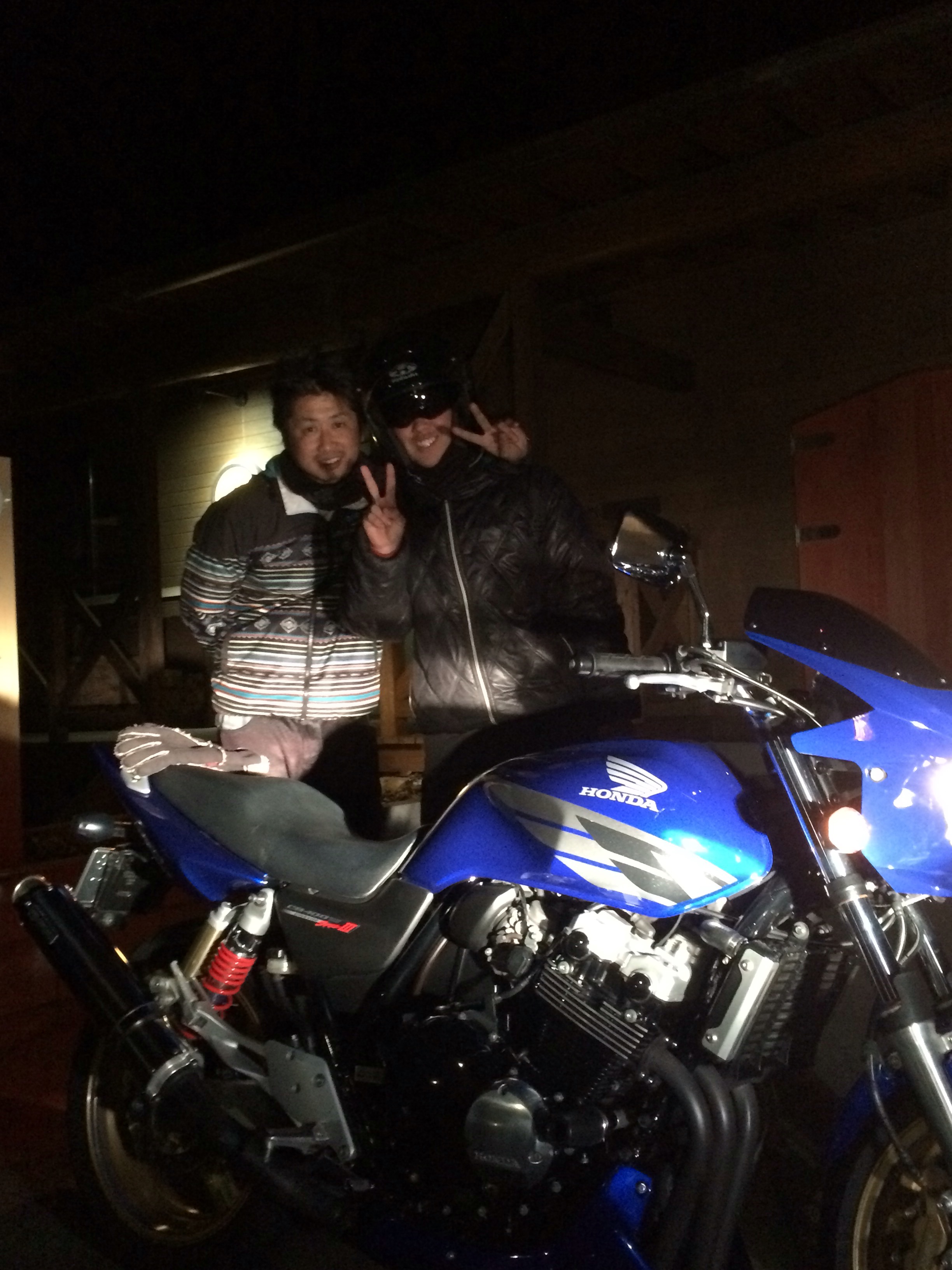 今日、納車したCB400に乗って遊びに来てくれたA君です^o^ 新車かと思うくらいピカピカですよ? ブイテックが良い感じらしい‼️ 飛ばし過ぎたら駄目だよ( ̄(工) ̄)